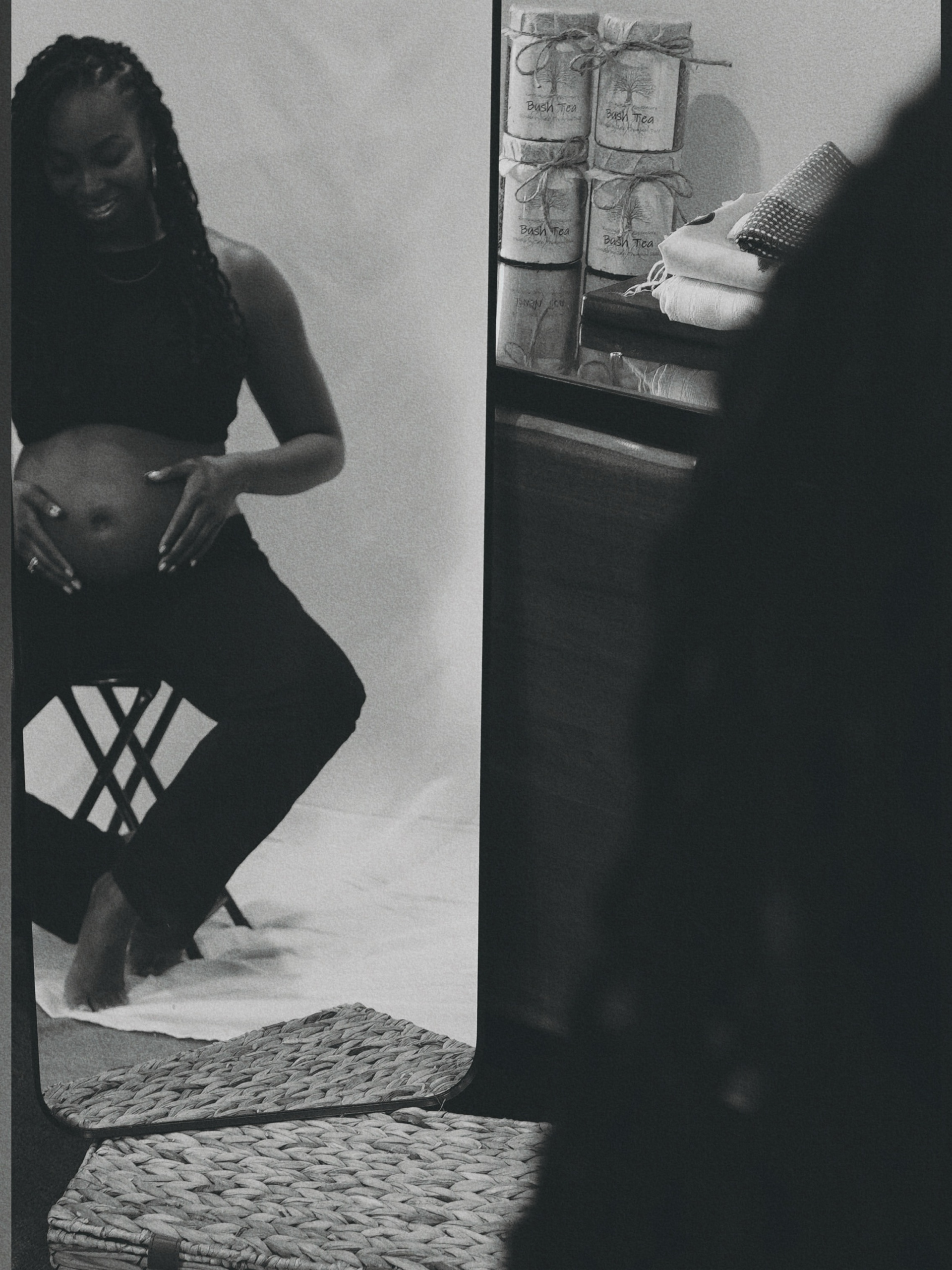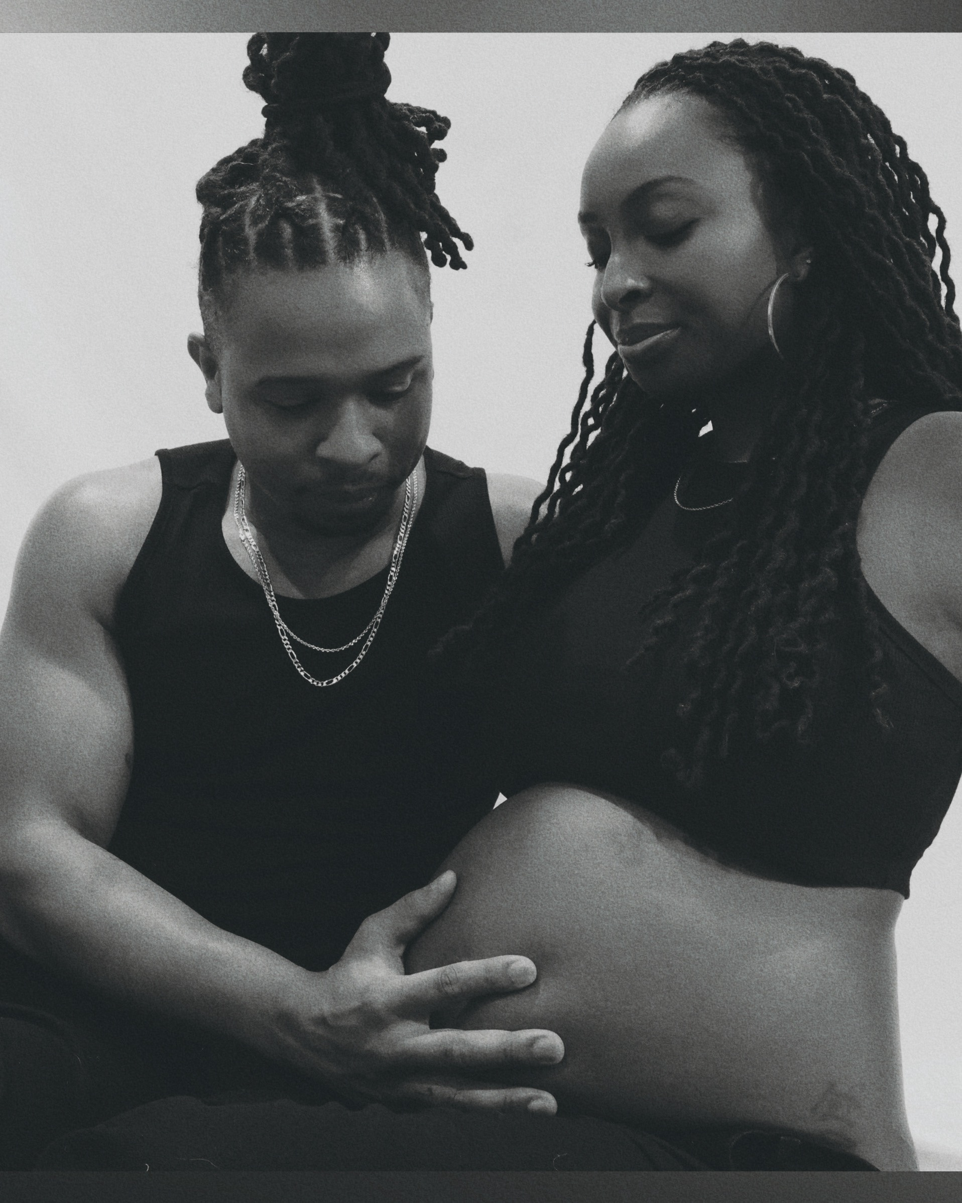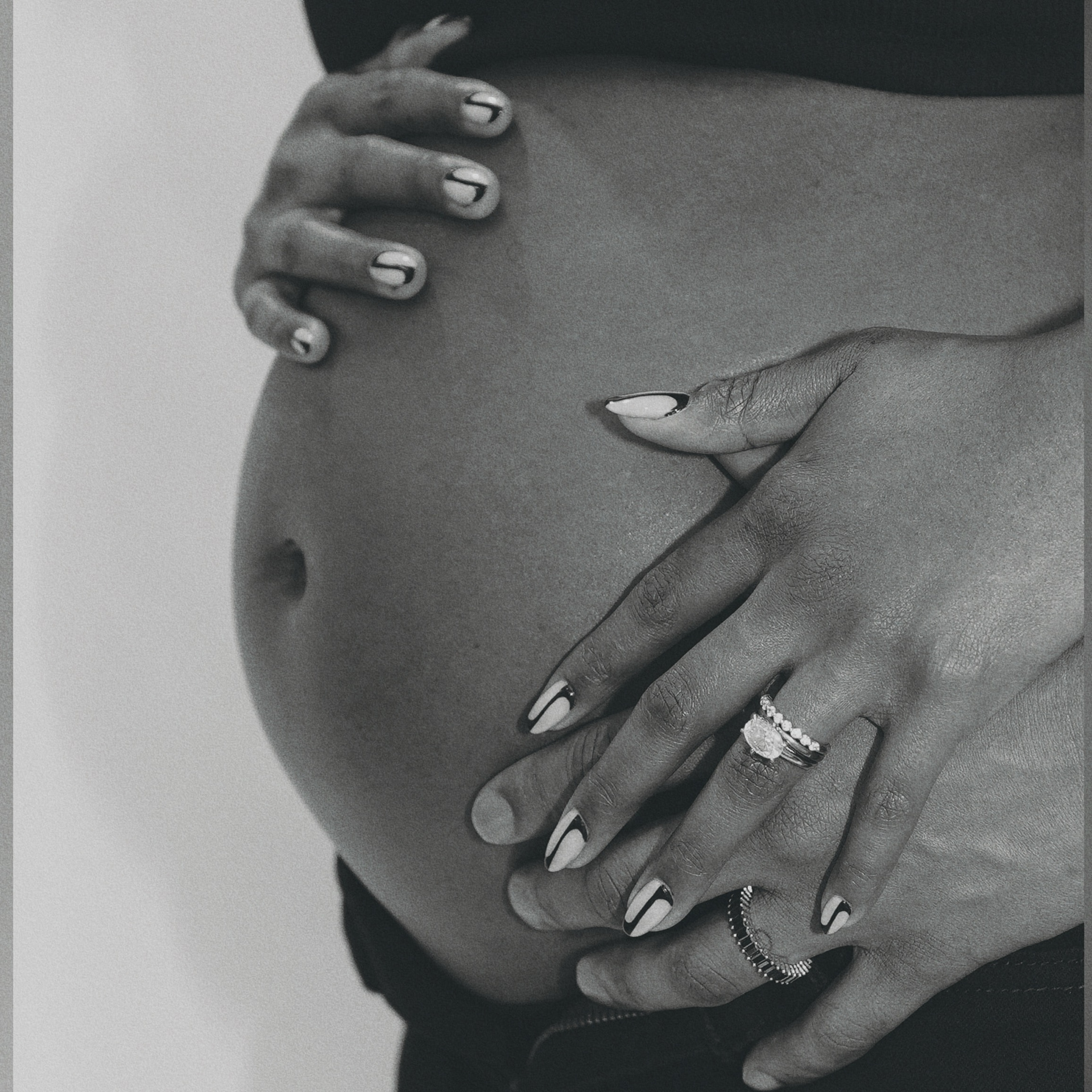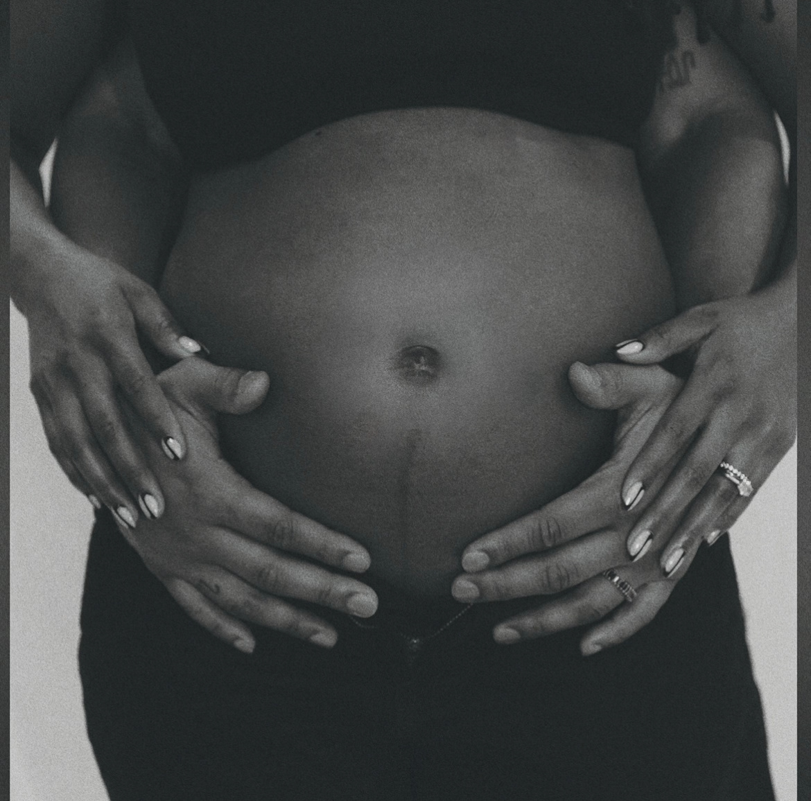 Capturing photos of a special moment for a baby announcement. Color-treated in black and white with a vintage grain effect. Shot using a Sony ZVE10 camera and Sigma 16mm lens.